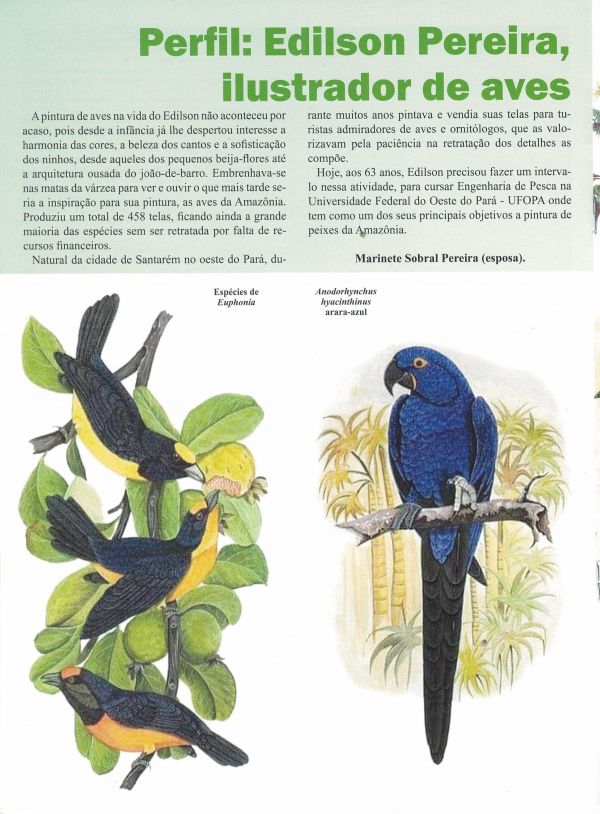 Nas páginas centrais da revista, sua esposa traça pequeno perfil do Edilson, com dez pinturas de aves ilustrando a matéria, que recebeu o título - Perfil: Edilson Pereira, ilustrador de Aves .