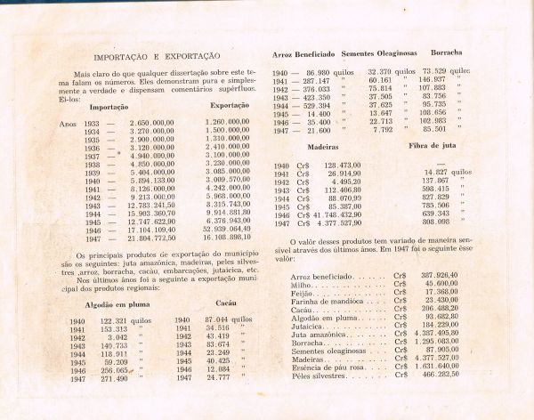 Interessante destacar os dados da balança comercial do município, que de 1933 a 1947 somente em 1946 alcançou superávit, quando a receita das exportações de produtos primários regionais: juta, madeira, peles silvestres, arroz, borracha, essência de pau-rosa, cacau, jutaicica, etc, foi superior aos custos com a importação. Sendo que juta, borracha, madeira e essência de pau-rosa foram as mais importantes na geração desse superávit.